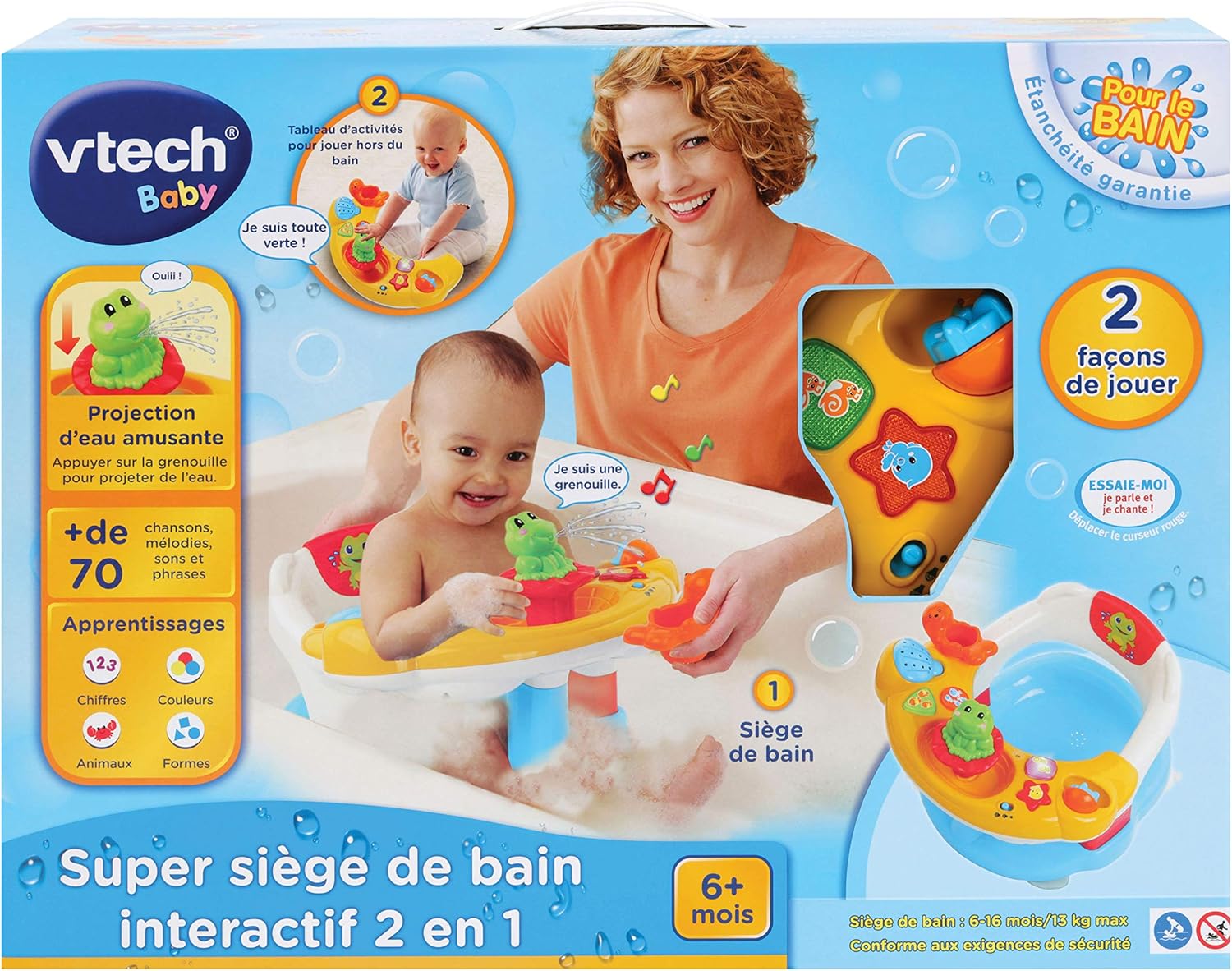 Splish Splash Learning Fun! Transform bath time with this 2-in-1 interactive bath seat! It keeps your baby secure while the fun activity panel, with water features and buttons, teaches colors and marine life through French songs and phrases.